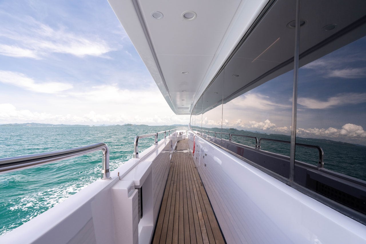 Dining options are diverse and refined. Guests can enjoy al fresco meals on the aft main deck with stunning ocean views. For a more casual setting, the saloon provides a relaxed dining area. The bridge deck features a formal dining space with glass doors that connect the inside and outside, offering a seamless dining experience during your superyacht charter in Phuket.